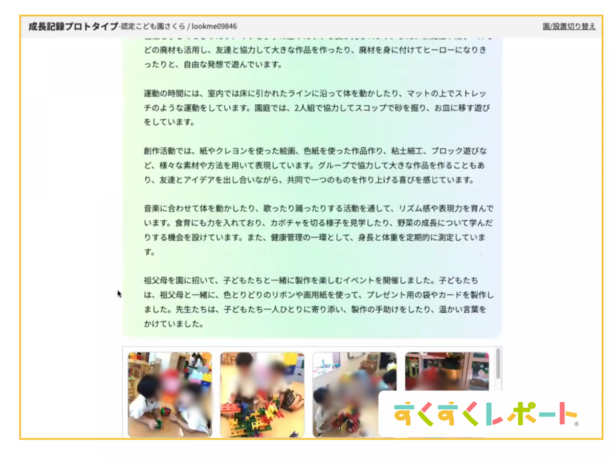 AI(人工知能)を活用して園児一人ひとりの成長記録を自動で要約。「ルクミー」の写真や連絡帳などの記録データから、お子さまの「育ち」を要約し自動的にレポートにまとめて可視化します。