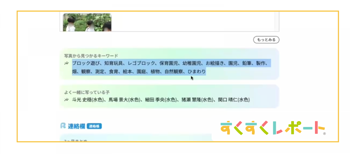 - クラスや個人の「キーワード」から、なにがこどもにヒットしているのかが瞬時にわかる。次の活動のヒント・ひらめきになる